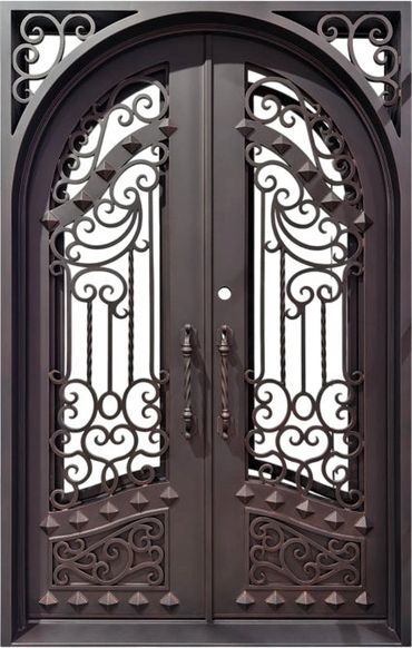 Elegant black wrought iron double door with intricate scrollwork.